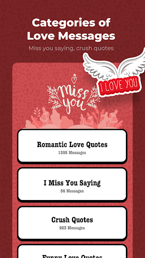 I Miss You is a love message collection app. It contains 600 love messages and quotes to express your love. You can find the love messages and quotes in this "I miss you" app and send the messages easily via SMS, Facebook Messenger, WhatsApp, WeChat and other social apps.