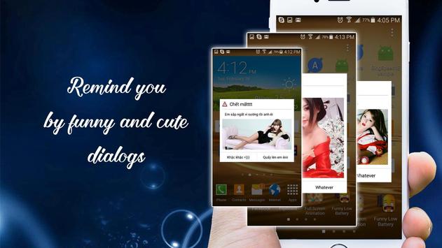When your phone battery weak, there will be Hot Girl inform you It is interesting right? Funny low battery notification is an extremely interesting applications to help you customize mod notification when the battery is low with the image and the text, the words "slogan" that you love!