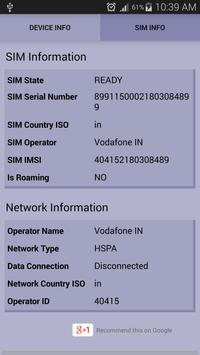 SIM Details : Operator name, SIM Status, SIM IMSI, Roaming Information, Mobile Data Status, Country ISO.
