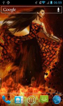 Beautiful girl standing in the fire! Her long hair is fluttering in the wind!