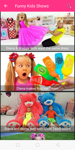 The app contains the most amazing diana shows - Are you crazy to watch the funny shows then download our diana app to start make entertain yourself by watching the toys review videos and much more like roma shows for free. The app contains the hundreds of categories including videos like playing with truck & funny doll videos, amazing frog and suprise eggs videos.