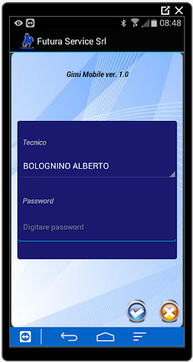 Per accedere al menù della procedura Gimi Mobile il tecnico si autentica selezionando il proprio nominativo e digitando la relativa password di accesso.