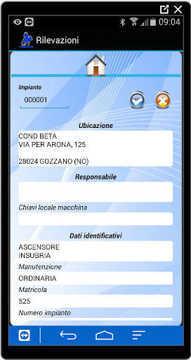 Alla rilevazione dell’impianto vengono visualizzate le principali caratteristiche tecniche come marca, matricola, numero impianto, date di prevista manutenzione ordinaria, semestrale e biennale e altro ancora.