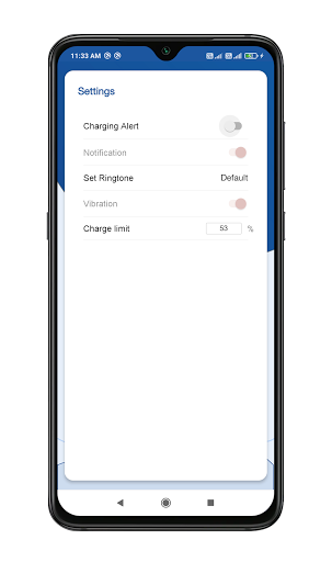 You can set a Charging limit for alert and set an alarm tone for an alert with vibration.