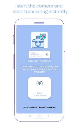 Camera Translator is a free Application it allows you to detect with an expert algorithm the language displayed instantaneously on your camera and translates the displayed text to you in a few moments, we manage more than 100 languages.