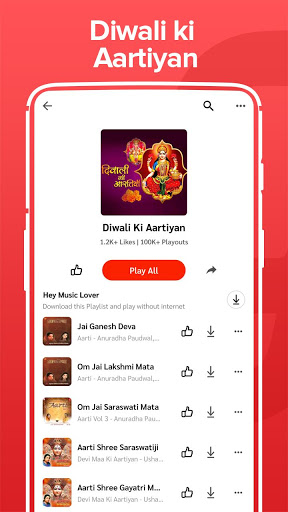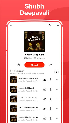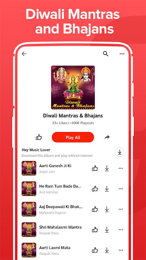 You can also listen to special playlists and albums for Diwali music like Diwali Mantras, Diwali Pooja, Diwali ki Aartiyan, Diwali Party, Fireworks, Haryanvi Diwali party, Shubh Deepawali Pujan, Deepawali special Aarti Sangrah, Mantras & Dhun, Shubh Diwali Chants, Bhajan and Aartis, Diwali special- Mahalaxmi Bhakti Geet, Deepawali special bhajans, Diwali special Devotional Songs, Jai Ganesh Jai Lakshmi Mata, Dhanteras Special, Laxmi Mata Bhajans, Diwali aur Deep- Laxmi Bhajan, Shubh Diwali, Diwali Puja Vidhi, Diwali ke patakhey in Hindi; Shubho Dipavali in Bengali, Gujarati Geeto ni Dhamal- Diwali Special, Diwali special Aarti Sangrah- Gujarati, Rajasthani Diwali pooja special; Happy deepavali, Deepavali top 15, Party Top 10, Deepavali Payanam in Tamil, Belakina Habba Deepavali, Deepavali Namma Maneyali, Deepavali Haadu in Kannada, Happy Deepavali, Party, Maainti Deepavali, Deepavali spl- Devotional in Telugu; Deepavali special albums in Odia, Bangla, Marathi, Bhojpuri etc.