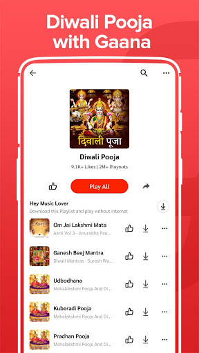 Enjoy traditional Diwali puja songs, Deepawali ka gana, party songs, Ganesh ji and Laxmi Mata Bhajan on the Gaana App like Om Jai Lakshmi Mata, Jai Ganesh Deva, Jai Ambe Gauri, Om Jai Jagdish Hare, Gayatri Mantra, Kuberadi Pooja, Ganesh Beej Mantra, Mahalakshmi Mantra, Ganesh Chalisa, Shri Ram Amritvani, Mangalbhawan Amangalhari, Jai Hanuman Gyan Gun Sagar, Lakshmi Mata Mantra; punjabi & bollywood songs like Happy Diwali, Morni Banke, Mundiyan, Dil Chori, High Rated Gabru, High Heels, Patola, Nachange Saari Raat, Suit Suit, Coka, Dheeme Dheeme, Gallan Goodiyaan, Glassy, Prada, Oh ho ho ho, Twist Kamariya, Let's Nacho, Kala Chashma etc. in Hindi; Pogadhe, Kadhal Vaithu, Kannak Varum Velai Dhol Baje, Thoduvaen, Top Tucker, Ayya, Goindhammavaala, OMG Ponnu in Tamil; Sri Mahalakshmi Astakam, Aadi Lakshmi, Devendrakrutha Mahalakshmi Stothram, Sri Lakshmi Gayatri Stothram, Dhanya Lakshmi Vachinde, Boom Boom, Paisa Vasool, Nee Kallalona, Raja the Great in Telugu; Gajamukhane, Rajeshwari Shive, Ganesha Ninna Mahime Apaara, Vijaya Lakshmi, Yelliruve Thande Baro, Ganapathi Oliyutha Baaraa, Belakendare, Naadinanda Ee Deepavali in Kannada etc.