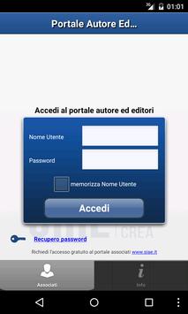 L'App di S.I.A.E. per gli autori ed editori associati l'applicazione consente l'accesso ai servizi online dedicati e la consultazione delle posizioni personali (dati anagrafici e generali, movimenti contabili, repertorio depositato presso le Sezioni, dati analitici sulle utilizzazioni delle opere e sui relativi incassi per diritti d'autore).