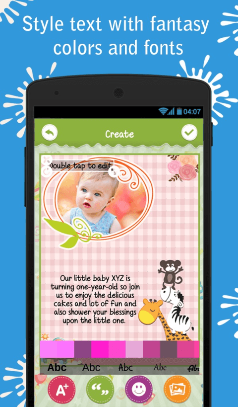 The birthdays are the most awaited day of the year for anyone especially for small kids who would be very excited for all the gifts and the cake that they are going to cut during the birthday party celebration. Birthday party invitation would be a perfect app for all the party givers to invite their friends and relatives in a totally new way. Select from a whole lot of beautifully designed card collection with different party invitation quotes in it. Select the image of the birthday guy from the gallery and paste it into the card with a birthday quote and then share it to all your friends and invite them to your awesome party. Features: 1) A lot of different and beautiful card collection with different quotes on each. 2) Select the card that you like the most and also insert your favourite birthday quote into it. 3) Select the image of the birthday guy from the gallery, add smileys and do other editing options to it. 4) Also create your own card with your own quote and design it the best way you like it with so many editing options available in it. 5) Save the card that you created into the gallery. 6) Share the beautiful birthday with all your friends to invite them to the party.