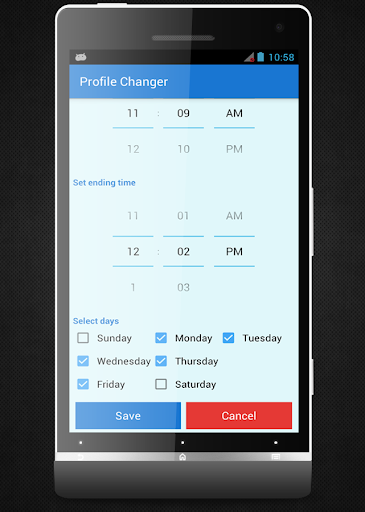 Then this app will make your phone smarter by changing the phone mode automatically based on configurations. You just need to create a profile and set the time (start and end), day and mode (Silent/Vibrate/Ringtone/Airplane) then the rest of the things are taken care by this app.