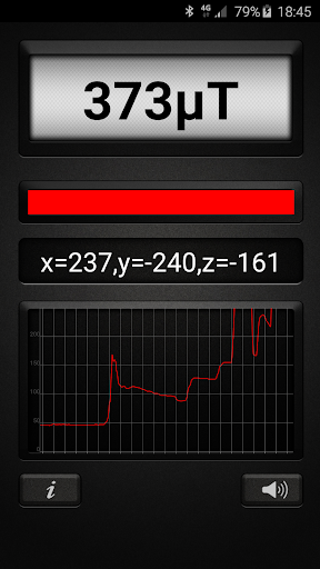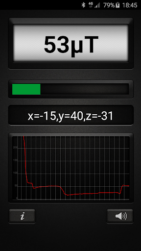 Metal Detector app uses your devices magnetic sensor to measure magnetic field values and turns any Android into a real metal detector. Data is displayed in µT (micro Testla). 1µT = 10mG (milli Gauss). The magnetic field in nature ranges from 25 to 65 µT (0.25 to 0.65 G). Any higher measurement is an indication of metal in the area. When there is metal in the area, magnetic field increases. App works best detecting ferromagnetic materials, such as iron and can’t detect non-ferromagnetic materials such as aluminum. App works best detecting metals up to 15cm away.