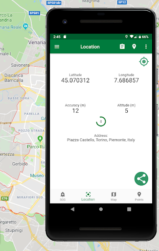 • View current GPS location data: latitude, longitude, altitude, accuracy, address