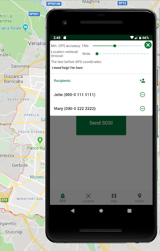 • Prepare a list of recipients who can receive the current GPS location data (latitude, longitude, altitude, accuracy, address) in case of emergency