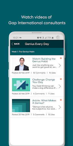 • Access to Genius Every Day, a year-long program of fun and fast learning modules that prompt you to practice leveraging Genius thinking in your day to day work