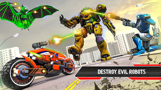 The superhero transforming robot war begins into robot bat hero grand city attack robot shooting after the alien robots invade with the mission to rule over the robotic machines. Start grand city robot fight of the future battle of robots with amazing bike transformation games to eradicate the bad robots of NY city in police bike games and police robot games. look forward to removing these monster transforming robots from machine robots in this ultimate mega robot wars 2020. let's start the shooting mission of police robot wars and enter into transforming robot wars in police robot shooting games and light bike robot war games. You want to win a super bat fight, so transform into bat hero of the mech robot warrior against the furious battle machines. Unleash your super robot powers in real robot gun war games and fighting machines to tackle the super robotic mafia in unlimited real robot wars games. Start best robot game to earn the reward from army robot hero games and unlock the strongest multi power robots to fight against mech robots and drone robots.