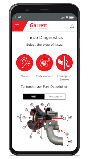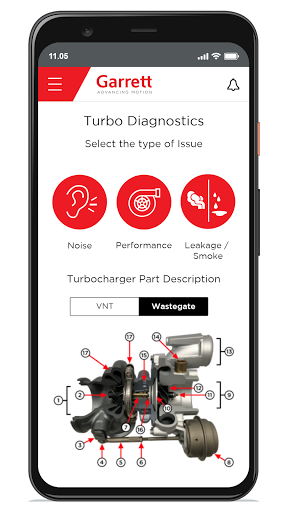 Using Garrett Turbo Diagnostics tool you will be guided through a series of tests and potential issues to uncover malfunctions and you'll receive the suggested actions. You can generate your own report and save it as a PDF file on your device.