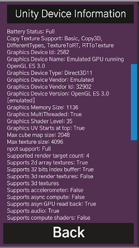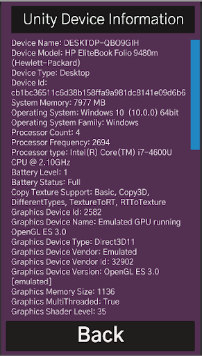 Unity device info provides comprehensive details of your underlying operating system and hardware. See the screen shots attached for more details.