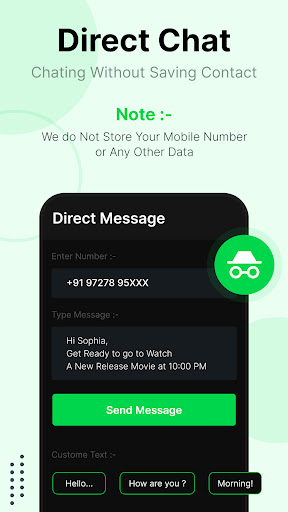 WhatsDirect is a useful utility to WhatsApp directly without saving unknown numbers. Direct message supports mobile number entering as well as copy paste from call logs facility to enter mobile number. Whatsdirect is a great tool for your favourite messenger app to send messages to any numbers those are not saved in your contacts.
