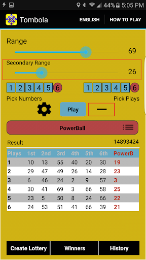 -Select a Secondary Range between 0 to 100 to add a special number in the Play outcome. e.g. 24,05,10,35,4 15