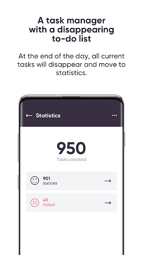 Make a list of what you want to do in the “tomorrow” tab. The next day, this list will be your guide for what you need to accomplish. At the end of the day, all tasks will disappear. “Statistics” will show both completed and uncompleted tasks. You can reschedule or delete uncompleted tasks as you wish.