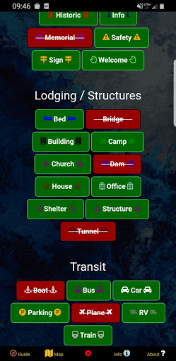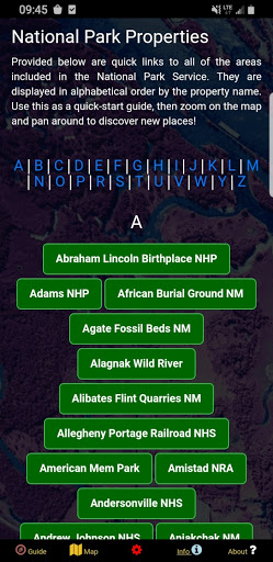 Once using the app, there are five screens. The Guide screen will provide data legends as well as helpful tips for optimizing your navigational experience. On the Info screen, you will find a number of spatial links to the different NPS properties, parks, memorials, and monuments. This is a great way to quickly locate specific places and discover new parks! The About screen provides links to all of the open-source resources used in the app and gives a little information about the developer GeoPOI. The Map Settings screen is where you can change between one of four different basemaps, download offline imagery, turn on geolocation, and toggle specific point categories. Finally, the Map screen is where it all comes together!