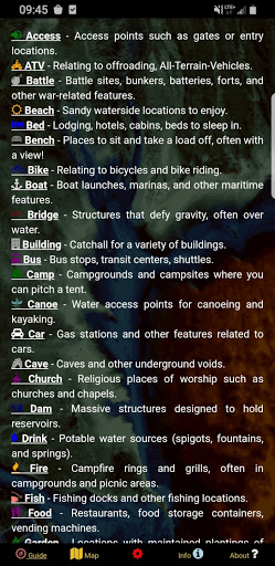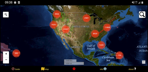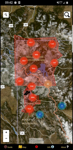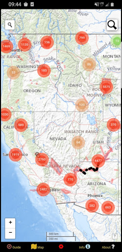 On the Map screen, there are a series of circle clusters at distant zooms that indicate how many points are within a given cluster. As you tap the clusters to zoom in, individual points and icons become visible, along with trails and boundaries. These features can be clicked on to reveal the name, location, and other useful information. The map screen also has two search tools - the left one can be used to look up addresses and towns, while the right one will allow you to query the names of the features in the database.