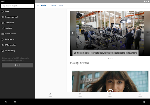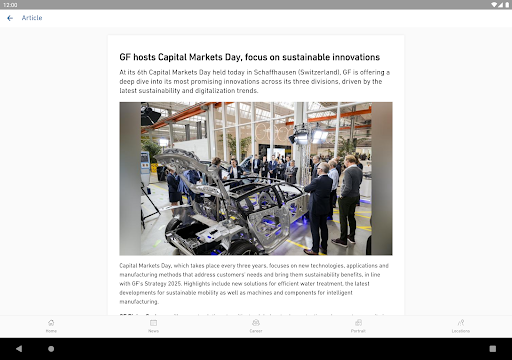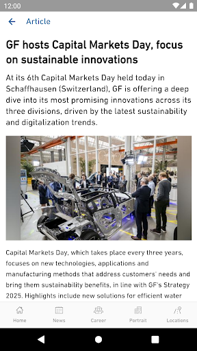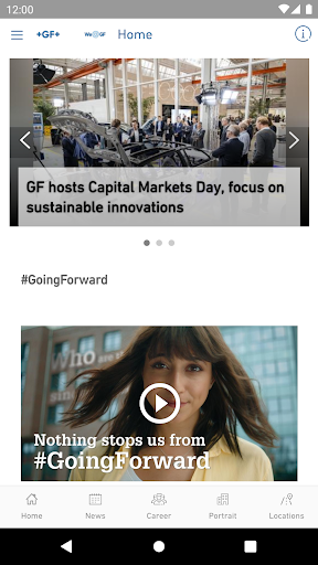 The app provides comprehensive information about the company, its business activities, corporate culture, a location overview, and access to global job postings and career opportunities at GF. The offering is complemented by success stories, videos, announcements, and information on other GF communication channels and media. The content is aimed at the general public as well as customers, suppliers, employees and anyone who wants to receive information and news quickly and easily via smartphone.