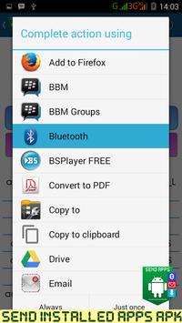 Send directly apk's file using Bluetooth if you have offline Android device or share using E-mail, Facebook, Messenger, Google Drive and other online connected social network.