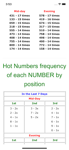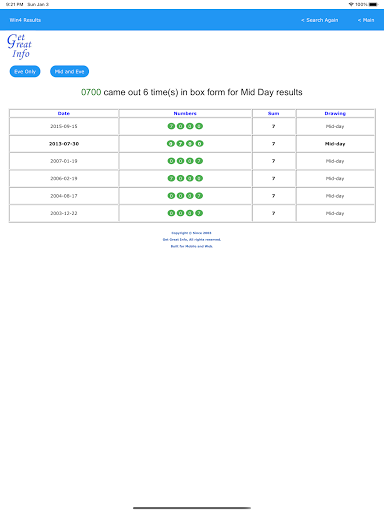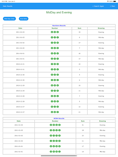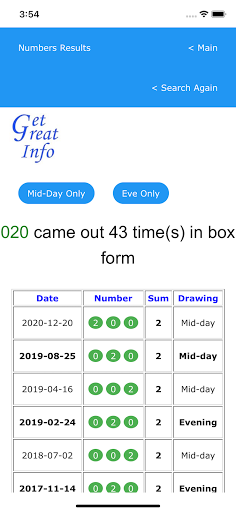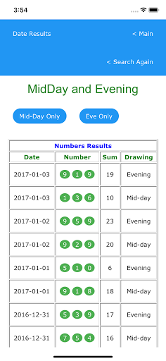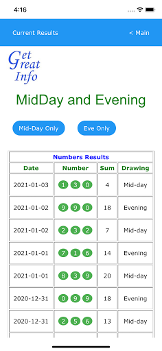The true feature of this app is the ability for the users to search past results and analyze what numbers to choose to play. We do not claim to produce winning numbers with this app. We only provide a database of past results for anyone who uses this app to determine what numbers they may play based on past results.