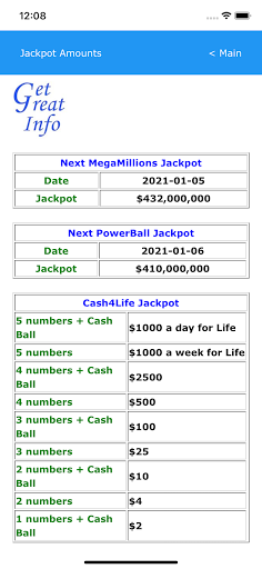 Look up the Jackpot Amounts for the Mega Millions, Power Ball, Lotto and Cash4Life games.