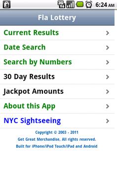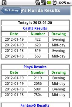 This is a free app to only display Today's results for all of the Florida Lottery games. Not all games are drawn at the same time. Besides seeing only Today's games, we have also added a new feature to do a Date search for the year 2011 and a number search for the Cash3 game to see when the numbers came out the last 3 times.