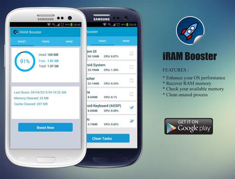 RAM Booster can make games on your phone run faster by clearing up resource draining applications. Is your Android device starting to feel sluggish? Then slug some power back into it with RAM Booster! You should always keep your system memory clean.