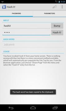 Hash It! eases using unique passwords per web site without overloading your brain by generating site-specific passwords derived from a secret master key.