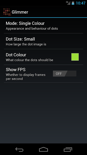 There are three modes: in colour changing mode, the dots change colour smoothly over a configurable period. In reflect light mode, the device's orientation is used to simulate light reflecting off the dots. As you tilt the device, the colour of the dots fade in and out in response. In single colour mode, the dots are all one colour but change in intensity. The size of the dots is configurable in all modes.