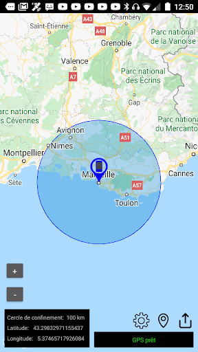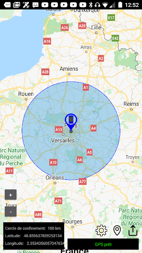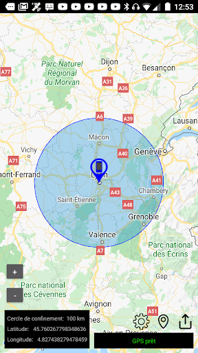 The application allows you to calculate a confinement area of 1km, 10km, 20km, 30km, 100km or 300km. around your GPS position. This allows you to respect and not to exceed the confinement area.