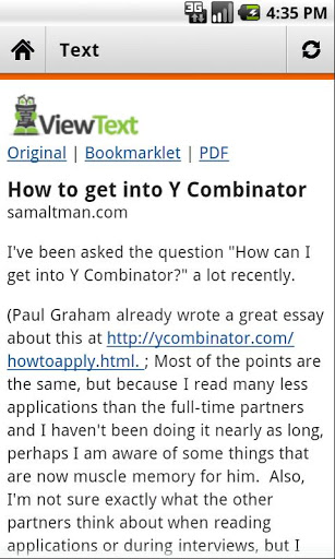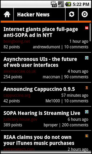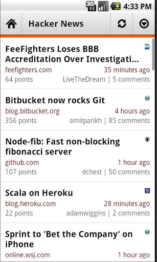 Hacker News Droid: Better Hacker News ExperienceEasy way to read and enjoy Hacker News on your Android phone. The app supports the following: Homepage news Newest Best Ask HN Comments Home screen widget Night Mode Inverse Color Mode Save for Later Bookmarking Text via ViewText.org Instapaper Integration Read It Later Integration Share news stories via FB, Twitter, SMS