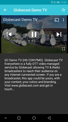 Globecast TV Everywhere is a fully OTT video managed service by Globecast allowing TV & Radio broadcasters to reach their audience on any Internet connected screen. If you are a broadcaster, this app could be yours, with your content, your colors and branding. Visit www.globecast.com and get in touch…