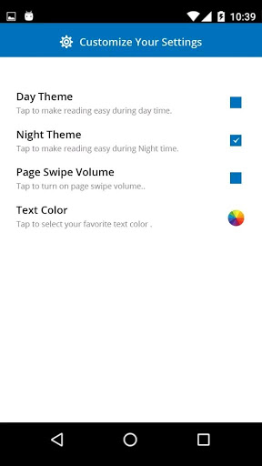 Turn on the page volume to make you feel like reading real book or turn off to read in silence.