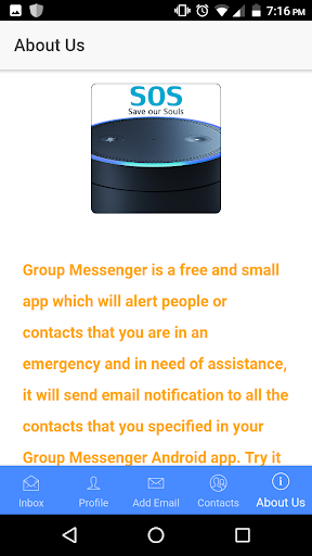 Group Messenger is a free and small app which will alert people or contacts that you are in an emergency and in need of assistance, it will send email notification to all the contacts that you specified in your Group Messenger Android app. Try it out I know you will find it useful.
