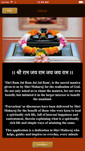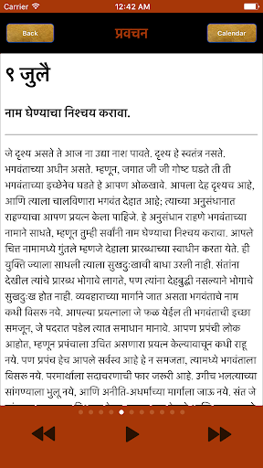 This is an application to listen and read Daily Pravachans of Sri Brahmachaithanya Maharaj Gondavalekar. It is organized to be accessed on a day-to-day bases. Also one can "Chant" the "Shri Ram Jai Ram Jai Jai Ram" Jaap.