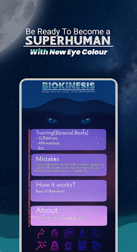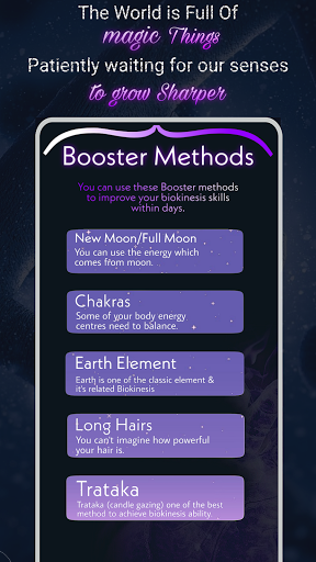 Are You Psychic? If yes so this biokinesis training app helps you a lot. you can test your psychic abilities. but its not about zener cards or clairvoyant test. if you want clairvoyance development then balance your 7 chakras and third eye (sixth sense) etc. moreover there is not any intuition games & tarot. but fully loaded with intuition training (poderes psíquicos)(intuicion magica). these brain waves(music) also help in astral travel (astral projection ) (viajes astrales). & it helps in all the psychic powers or psychic abilities like psychokinesis , lucid dreaming , trataka(candle gazing) , electrokinesis , telepathy communication , third eye (sixth sense) , aerokinesis , pyrokinesis , levitation , but this app is mainly designed for Biokinesis .