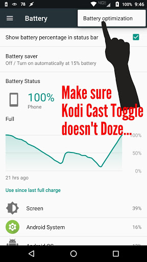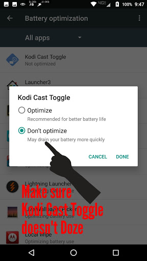 If the Toggle State toast messages aren't appearing when entering the Kodi app, please try taking KCT out of Battery Optimization Mode (screenshots in play store description - red text-). KCT will not adversely affect your battery life.