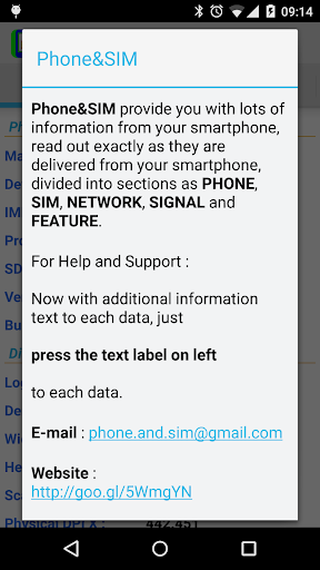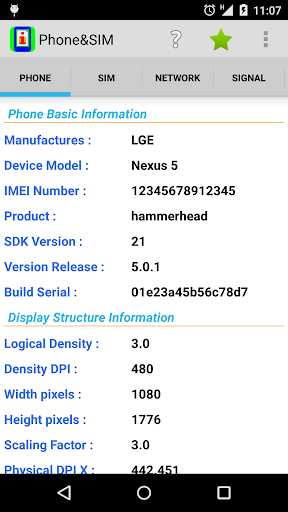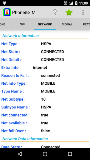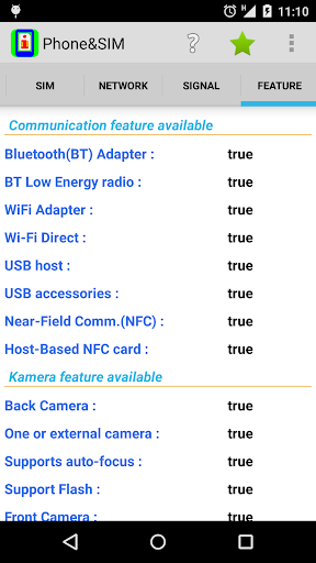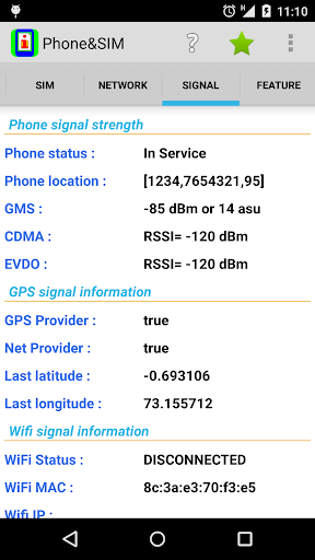 Phone&SIM provide you with lots of information from your smartphone, read out exactly as they are delivered from your smartphone, divided into sections as PHONE, SIM, NETWORK, SIGNAL and FEATURE.