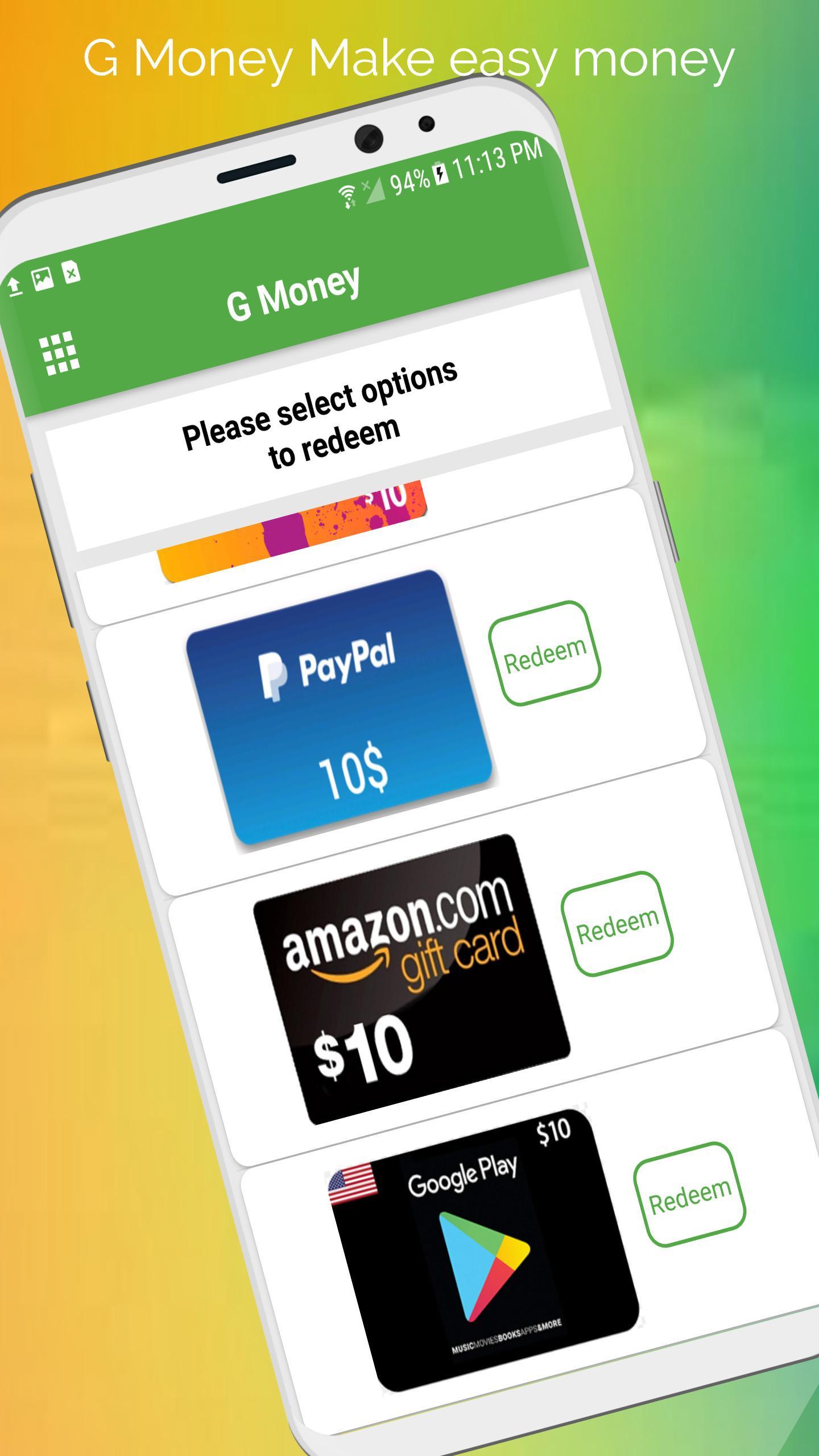 Share your opinion and earn free $5.00 Sign up bonus. Get quick dollar G Money rewards you with FREE Google play Gift Cards for sharing your thoughts via quick surveys and local survey events! Earn rewards on the go and redeem them for free $10 gift cards! As well as PayPal payment for participating. Win Prizes, Gift Cards & Real Rewards. Paid Surveys and Make money filling out surveys. Indeed, we can say we “Rewards your Opinion”