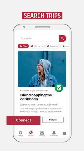 Search for your desired destination. When you like a trip, hit ‘Connect’ and start chatting instantly.