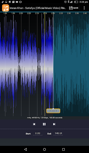 Now, touch and drag markers to set proper timing of song. Press the play button to preview the selected tone before saving it. Also you can manually edit start and end points of desire music file.Cut Music.Focus music and Filter it.ringtone maker,mp3 cutter.Best song cut,paste app,Music separator.