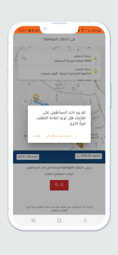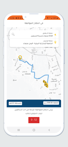 بعد تحديد نقطة الوصول واختيار نوع السارة وطريقة الدفع تضغط على زر ارسال طلب وتنتظر لمدة لا تتجاوز عن دقيقتان يتم فيها البحث عن اقرب سائق اليك وفي حال لم يتم الموافقة على طلبك بسبب عدم توفر او عدم رد احد السائقين على طلبك تستطيع بعدها تكرار الطلب او الغاء الطلب. بعد قبول احد السائقين عليك سيتم عرض الوقت المطلوب لوصول السائق اليك وتستطيع تتبع السائق وترى السيارة وهي في طريقها اليك وتسطيع ايضا الدردشة مع السائق ومعرفة تقييمه ومعلومات السائق ومعلومات السيارة وتسطيع الغاء الرحلة. في حال قمت بإلغاء الرحلة بعد الموافقة من السائق وقد مرت 3 دقائق سيتم احتساب غرامة عليك.