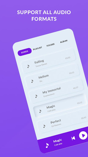 It’s not only a MP3 player. Music Player supports all music and audio formats including MP3, MIDI, WAV, FLAC, AAC, APE, etc. And you can play them in high quality.