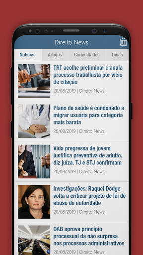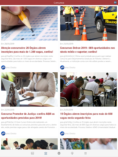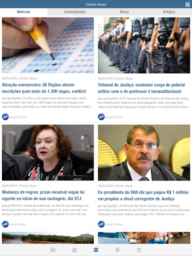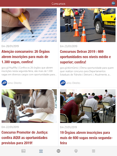 Conteúdos na área 'Direito News' divididos em Notícias, Artigos, Curiosidades, Dicas e agora também Concursos. Áreas distintas, como: