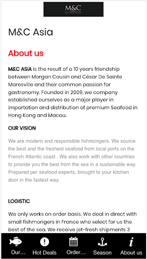 Founded in 2009, M&C ASIA has established itself as a major player in importation and distribution of premium Seafood from France, Atlantic and Pacific in Hong Kong and Macau.